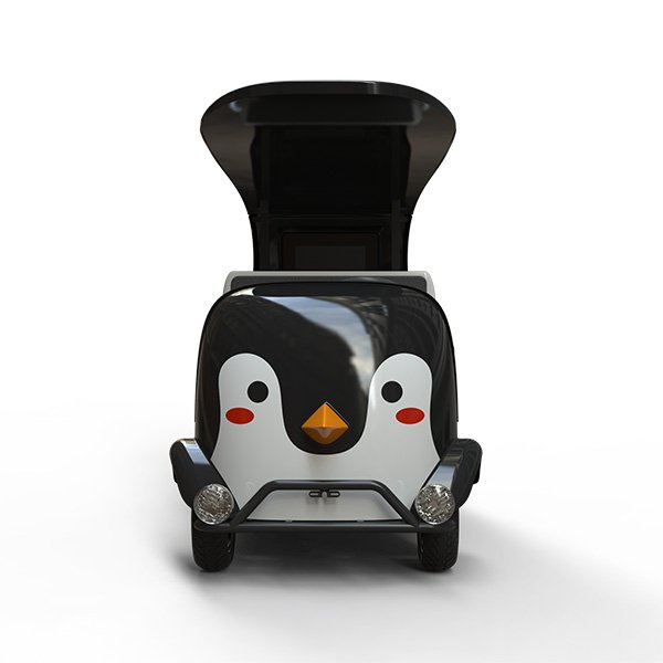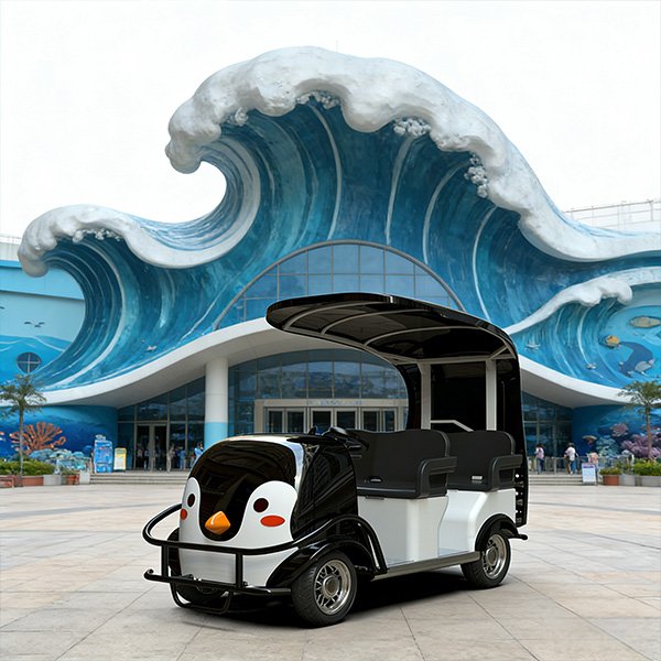 The four-seater cute-shaped sightseeing cart features a minimalist black-and-white color contrast design for a unique visual effect, with rounded body lines paired with a cartoonish front face. As a basic model, it can be customized with any decals on the existing vehicle for display.